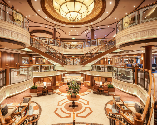 "One of the ship's most beloved features is the Grand Lobby, a dazzling centrepiece adorned with a sweeping staircase, gleaming marble floors, and a magnificent chandelier. This is the place where guests gather to relax and enjoy a drink, soaking up the timeless romance of ocean travel".