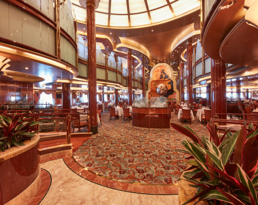 “This is Queen Victoria’s largest dining venue and the décor is elegant. The room's focal point, a 10-foot-tall illuminated world globe, is a beautiful reference to Cunard's history in sailing the world's oceans. Open to Britannia Stateroom guests with waiter service for breakfast, lunch and dinner, the menus are changed daily".