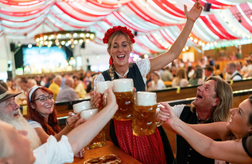 Oktoberfest's roots can be traced back to 1810 in Munich, where future King Ludwig was married, inviting the entire city to attend the celebration. The event, starting in mid or late September, attracts more than seven million national and international visitors annually. People dress in traditional Bavarian attire, enjoy traditional Bavarian foods (such as pork knuckle) and, of course, drink plenty of beer served in large steins.
