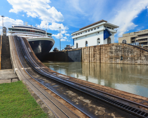 When ships transit the Panama Canal, they don't navigate it independently. Instead, they are guided through the locks by small locomotives known as "mules." These mules are used to keep the ships centred and prevent collisions with the lock walls. The term "mule" comes from the early days of the canal when actual mules were used for this purpose. It's fun for travellers to sit and watch these tiny locomotives do their thing!