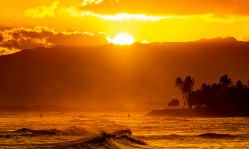 Honolulu is a bustling city on Oahu island in Hawaii, offering dazzling sunsets over the Pacific Ocean. As you sail away, you can see the sun setting behind the iconic Diamond Head crater from the ship, creating a breathtaking backdrop.