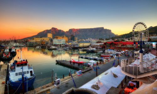 Cape Town, nestled between the majestic Table Mountain and the shimmering Atlantic Ocean, boasts an awe-inspiring sunset for those gathered to witness nature's grand finale of the day. As the sun descends to the sea, the cityscape is bathed in soft orange light, enhancing the beauty of the mountains, pristine beaches, and sweeping coastal vistas.